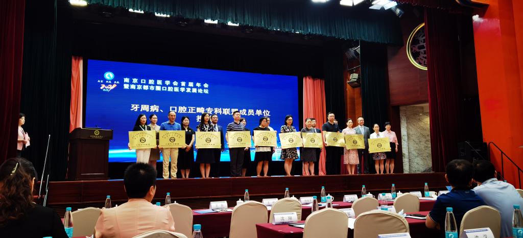 牙周黏膜科主任蔡扬作为代表接受授牌。本次盛会有南京大学医学院附属口腔医院(南京市口腔医院)集团牙周病科、口腔正畸科成员单位参加,覆盖南京都市圈及其他城市18个省份,共44个医院。
