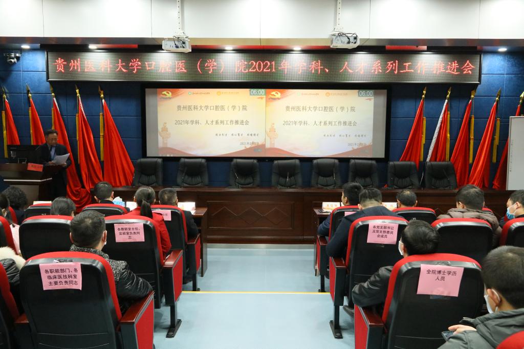 在行政楼五楼学术报告厅召开了2021年学科、人才系列工作推进会。贵州医科大学党委委员、副校长曾柱;贵州医科大学党委委员、副校长汤磊;贵州医科大学党委委员、党委组织部部长蒋红梅;贵州医科大学党校常务副校长李红;贵州医科大学人事处副处长朱俊伟及口腔医学院党政领导班子成员出席会议;各临床医技科室、各行政职能部门、各教研室、实验室主要负责同志、各党支部书记及党支部委员会成员、各分工会主席、各临床医技科室护理组长、全院博士学历人员、全院副高级以上职称人员、各科室中级及以下职称人员代表参加会议。会议由副院长王永主持。
