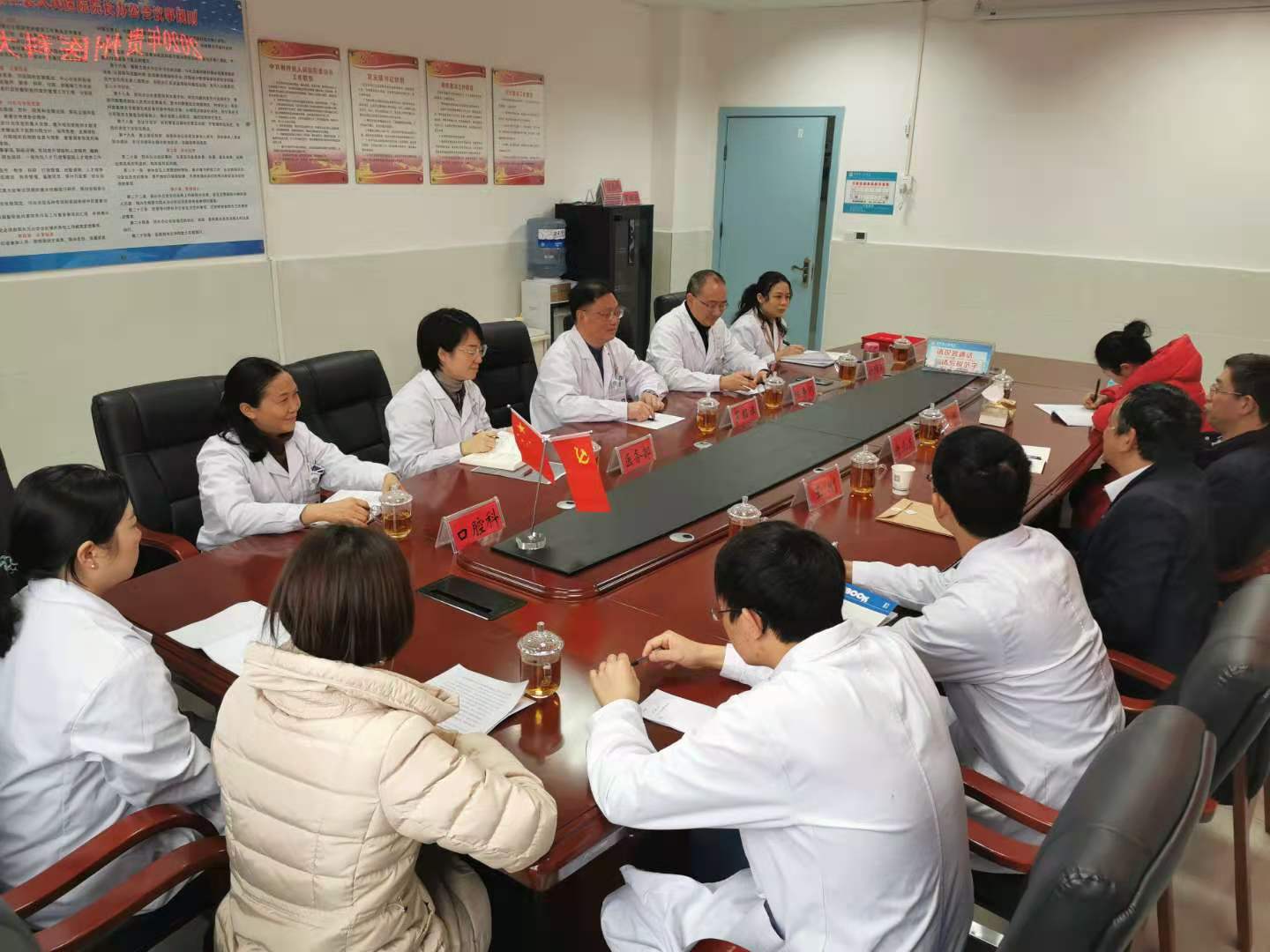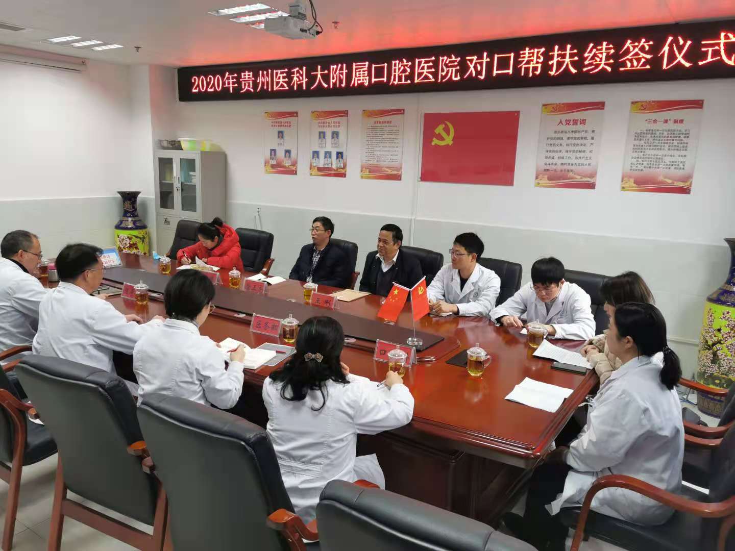 (后文简称口腔医院)应桐梓县人民医院邀请,由副院长唐正龙、医务科主任王刚及科员梁婷一行三人前往桐梓召开对口帮扶工作座谈会,并签订第二期对口帮扶协议。参会人员有口腔医院对口帮扶医师王珣、孙昆俊、李毓勤、帅宾宾和桐梓县人民医院党委书记罗昭旗、口腔科主任杨道芬、医务科主任金畅及护理部工作人员。座谈会由桐梓县人民医院院长陈寿川主持。