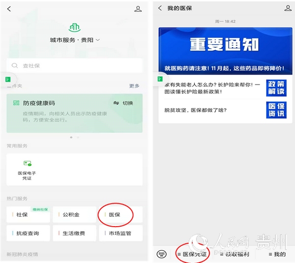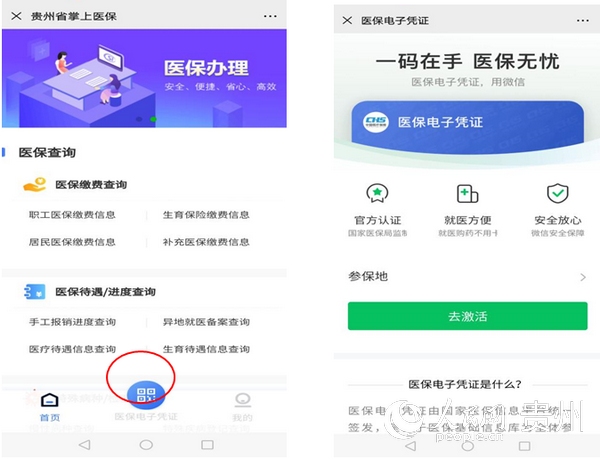 进入贵州省医疗保障局微信公众号—点击“便民服务”中“医保服务”—点击“医保电子凭证”,选择参保地—点击“去激活”页面,进入身份验证(输入6位数支付密码)—“授权激活”进行人脸认证激活。