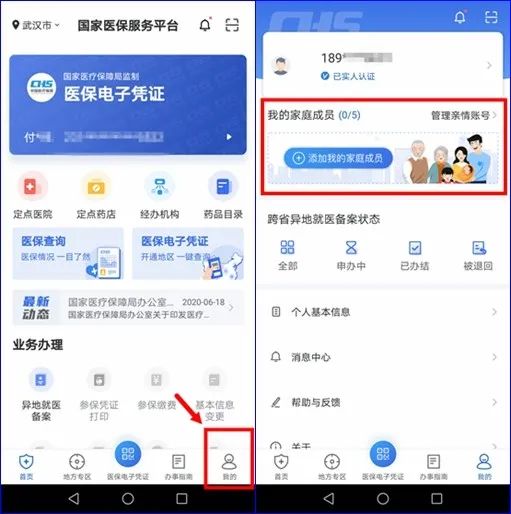 完成登录后,点击底部菜单【我的】进入个人中心页面,在【我的家庭成员】版块点击图标“+”添加亲情账户。