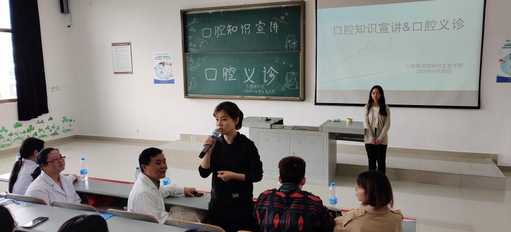 党委副书记钱禾带领口院教职工及部分研究生在九思楼4406教室开展了2020级新生口腔义诊及宣讲活动,大家齐聚一堂,共同学习和讨论口腔知识。宣讲活动由研究生科研管理科负责人廖健主讲,其余老师及学生配合宣讲,讲座从认识牙齿到口腔常见疾病、从如何护理口腔到怎样正确刷牙、从判断自己是否患有口腔疾病到如何帮助身边人培养口腔保健意识,事无巨细一一解答。过程中,组织开展了针对2020级新生的口腔义诊,让同学们在了解自己口腔健康情况的同时,进一步了解选择的口腔专业是如何深入生活和体现价值的。