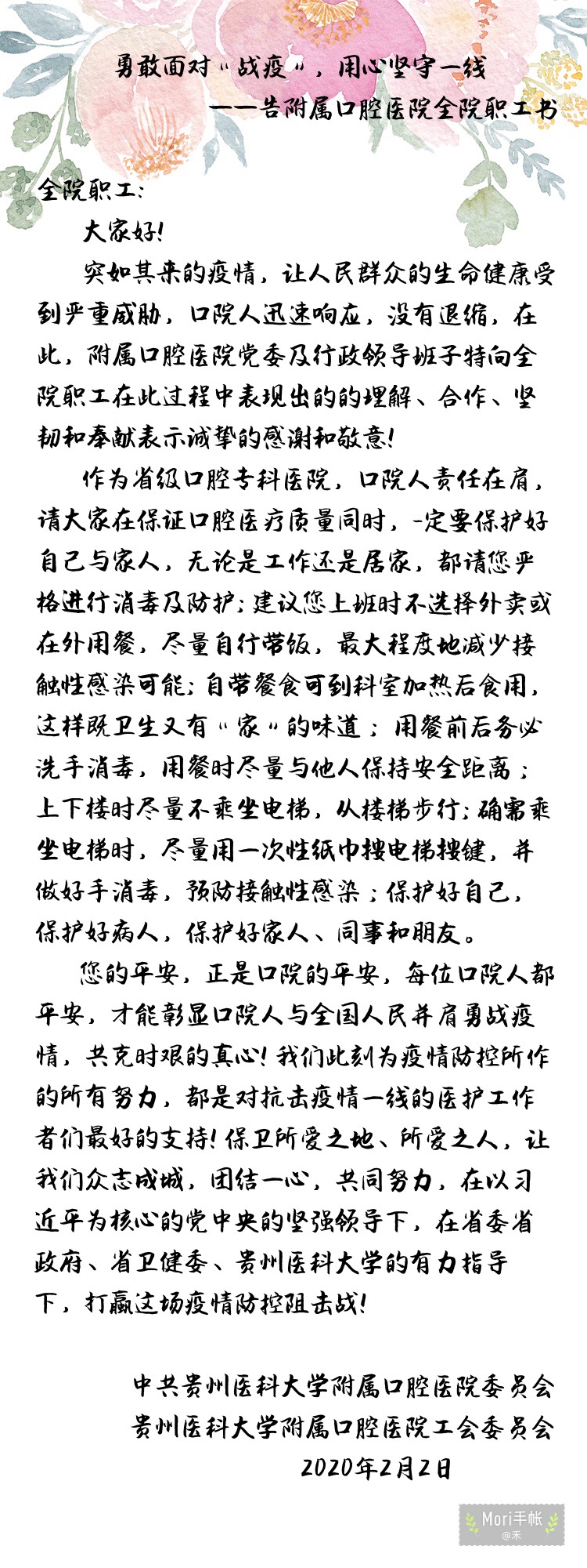 1、为鼓舞职工积极投入抗疫防控工作,工会发布了“告附属口腔医院全院职工书”。