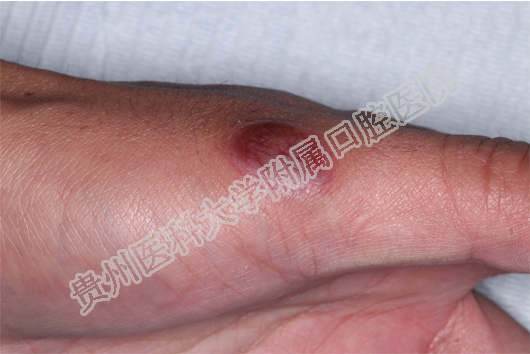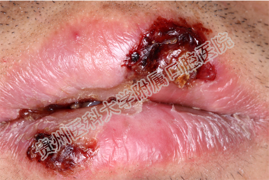 多见于嘴唇及颊部、舌头。开始时,口腔黏膜有烧灼感,明显充血发红、水肿,有时出现红斑、水疱,但疱很快破溃形成溃疡或糜烂。大面积的溃疡或糜烂会形成大量渗出物,形成假膜,疼痛非常明显,严重影响进食和说话。