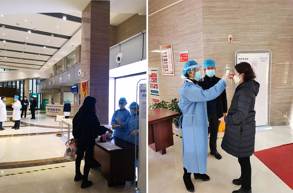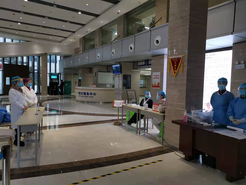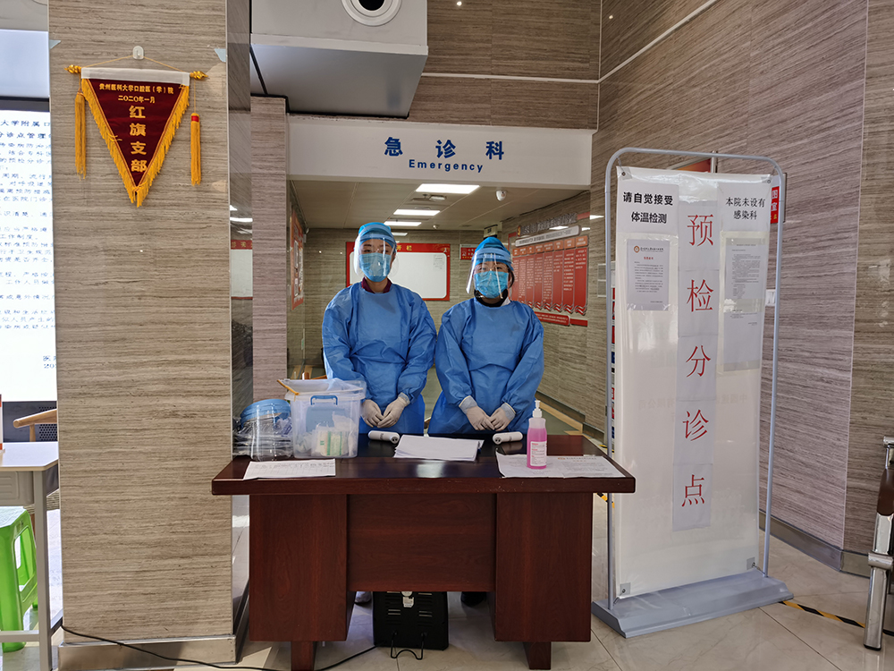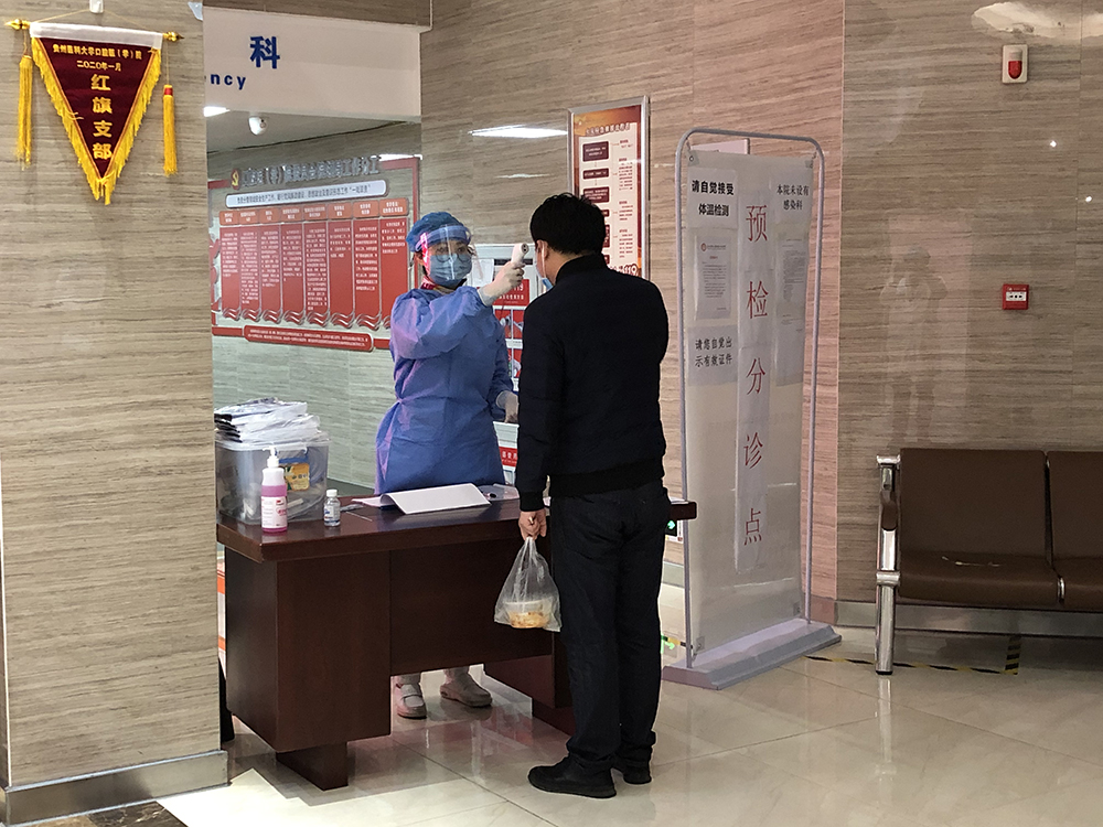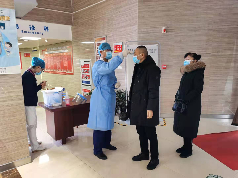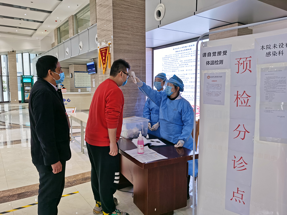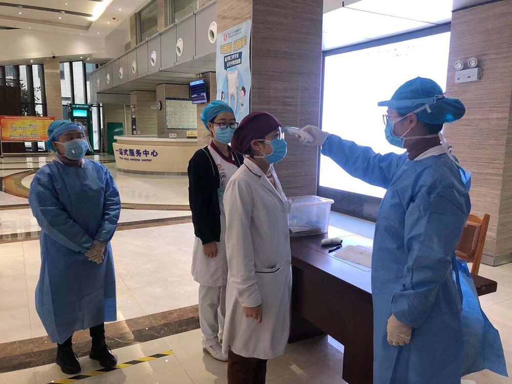 院感科、医务科、护理部以及八个教工党支部党员干部建立医院预检分诊队伍,承担起了筛查发热患者的重任,10小时关口前移,严防死守,成为了口院防控疫情第一道防线。
