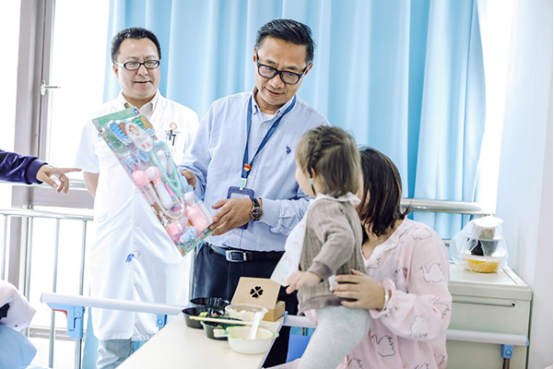 马洪院长与小朋友亲切交谈,鼓励孩子坚强面对病魔,并送上慰问礼物,让患者一家人感受到了满满的关爱。