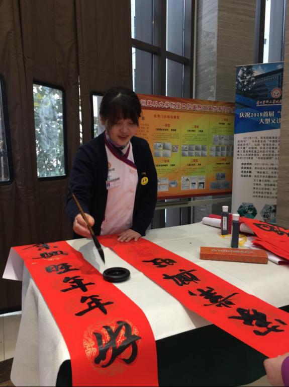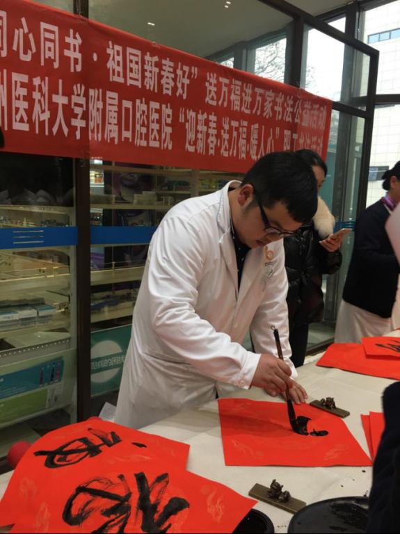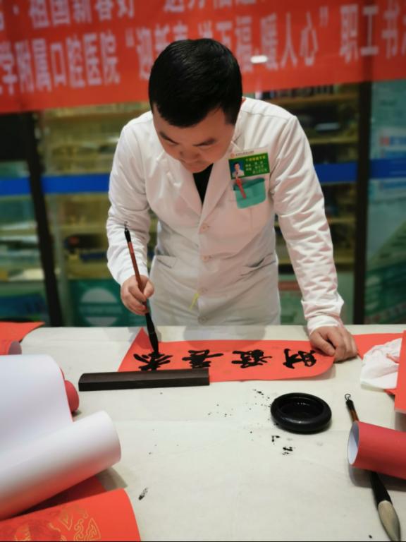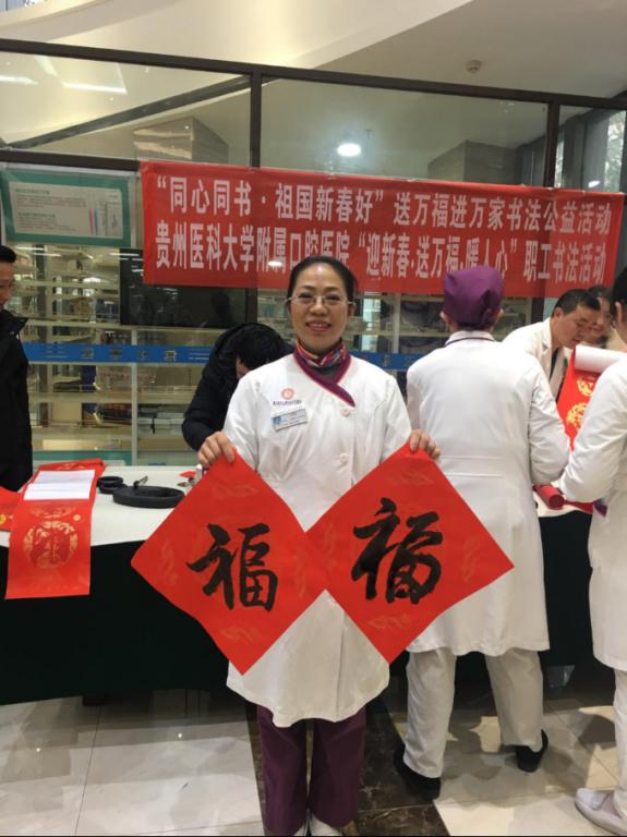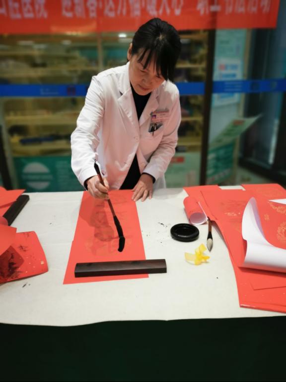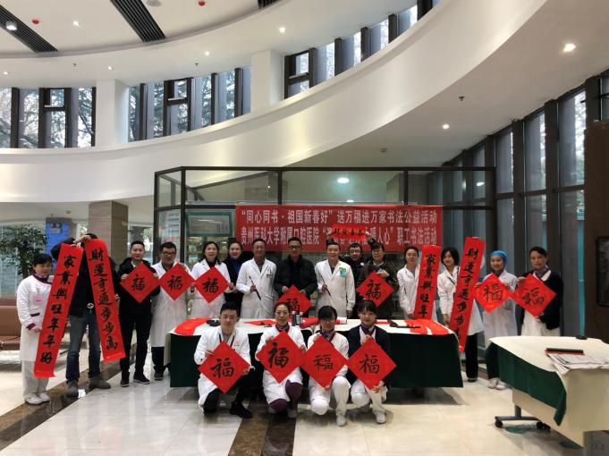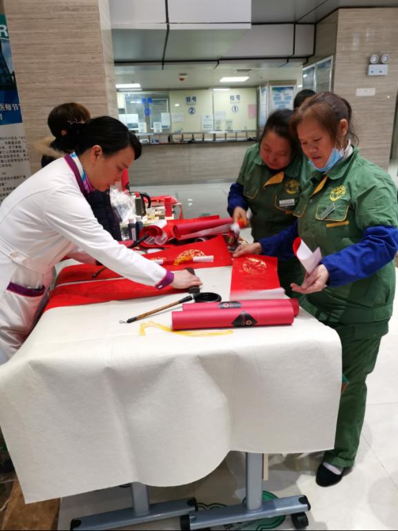 书法家王永副院长参加,徐卫华主任、廖健主任、陈仕红主任、谭旭副主任等老师也都积极参加了活动。大家用写春联和“福”字的方式将自己美好的祝福传递给职工及就诊患者们,为大家送上了猪年新春的第一份祝福。