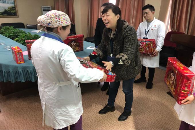 张书记与职工们进行了亲切友好的交谈。她说,院党政领导班子时刻将职工的事放在首位,牵挂着职工的生活。张书记祝愿职工们新春快乐,阖家幸福,希望在新的一年里,大家能够同心协力继续向着既定目标努力。工会主席杨蕾代表工会和职工们感谢张书记和院党政领导的亲切关怀,并表示院工会在2019年将会继续努力把工作落到实处,发挥好职工与医院之间的桥梁纽带作用。