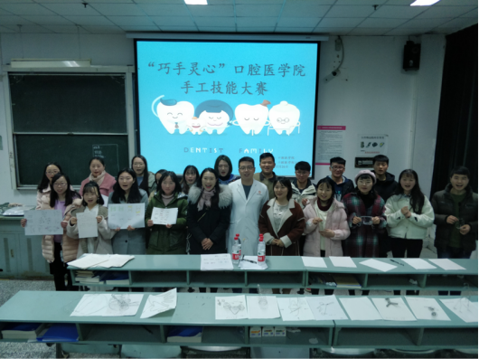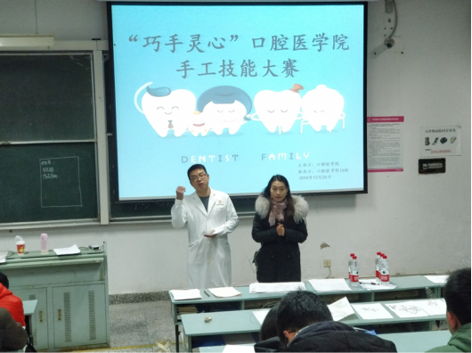 2018年12月26日16时,口腔医学院“巧手灵心”手工技能大赛专业组决赛在3201教室举办,牙周黏膜科罗亮老师、牙体牙髓科谭旭老师、正畸科杨桦老师,正畸科刘娟老师为本次大赛评委。