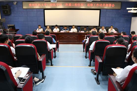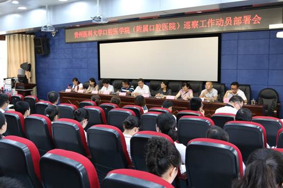贵州医科大学第一巡察组成员吴波同志宣读了《贵州医科大学2018年校内第二轮巡察工作实施方案》。巡察组副组长保蕾作动员讲话, 保蕾书记指出,开展巡视是加强党内监督的重要方式,是全面从严治党战略部署的重要内容,是国之利器、党之利器。巡察是巡视向基层党组织的延伸,是夯实基层党组织管党、治党阵地责任的具体措施,是对党组织和党员领导干部进行全方位的政治体检。学校党委高度重视,狠抓落实,通过校内巡察工作实现以查促建、以查促改,切实解决思想上和行动上的偏差,共同搭建一个健康、稳定、有序发展的校园生态。对口腔医(学)院党委领导班子提三点希望:一是切实履行主体责任,党委班子统一思想,提高认识,切实增强接受监督的自觉性和坚定性;二是切实加强组织协调,营造良好的巡察氛围;三要配合落实巡察有关纪律规定。