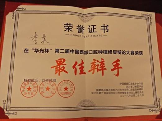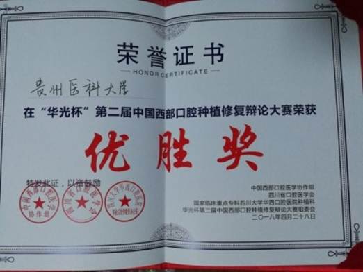 最终以微弱优势惜败空军军医大学,获得“华光杯中国西部口腔种植修复辩论大赛优胜奖”,其中董强老师,田艾老师获得“优秀指导教师”奖,李英(研究生一年级)荣获“最佳辩手奖”。