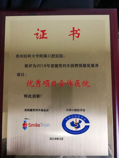 作为项目合作医院被“美国微笑列车基金会”、“中华口腔医学会”评为2018年微笑列车唇腭裂修复慈善项目优秀项目合作医院!