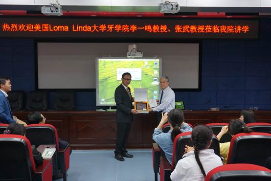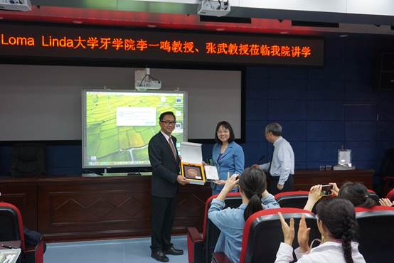 邀请,美国Loma Linda牙学院副院长、牙科学研究中心主任李一鸣教授携其夫人张武教授到我校进行访问和学术交流。在北校区(老药学楼)5楼学术报告厅,李一鸣教授作题为“美国牙医学教育面临的挑战”和 “种植体的单冠修复”,张武教授作题为“口腔牙椅水管微生物污染问题及解决”的学术讲座。讲座由口腔医学院马洪院长主持。