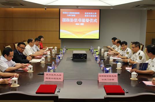 在深圳国检大厦2816会议室签署战略合作协议,正式建立全面战略合作伙伴关系。深圳出入境检验检疫局局长赵振拴,副局长胡龙飞,附属口腔医院院长马洪,党委副书记唐正龙,党委委员董强等出席签约仪式并共同见证了这历史性的一刻。