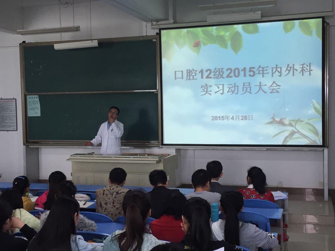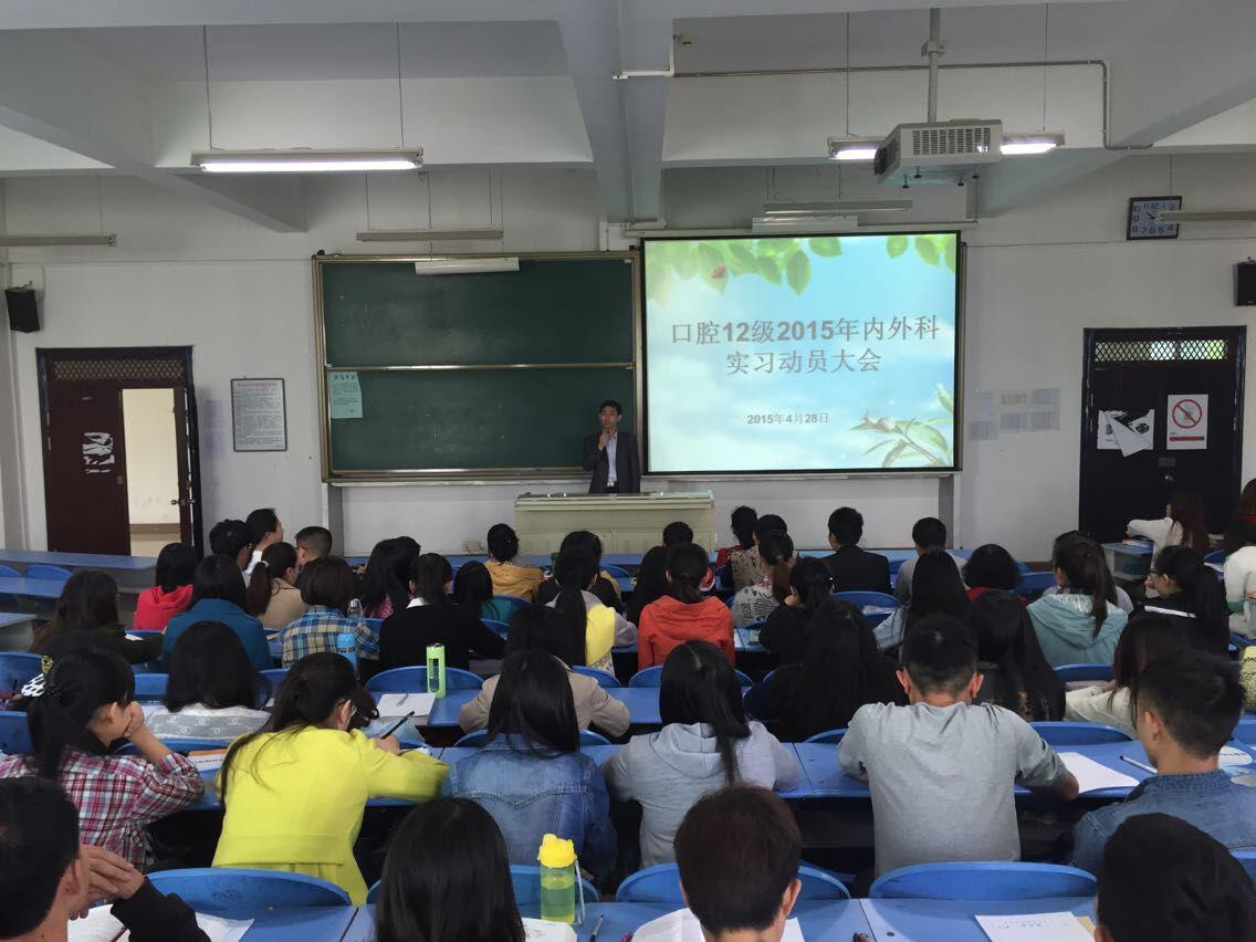 在2502教室召开内外科实习动员大会。口腔医学院党委副书记唐正龙、教管科副科长姚岚、口腔颌面外科吴睿老师出席大会,会议由辅导员胡睿老师主持,2012级口腔全体同学参会。