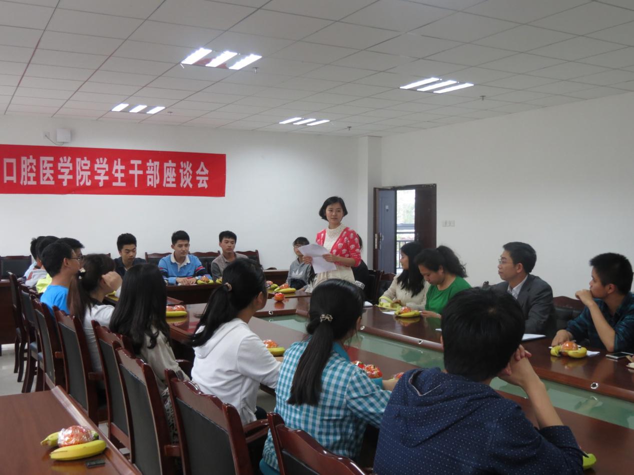 会议由钱禾老师主持,分团委学生会及各班学生干部做自我介绍,唐书记就学生干部培养工作提出了期望与建议,指出学生干部应当关心了解广大同学的思想动态,维护校园稳定,对有心理问题的同学及时进行疏导或汇报,不仅要学好专业知识,还要加强能力学习,在各项活动中起到积极带头作用,作好老师与同学、班级与班级之间的桥梁。唐书记还亲切地介绍了贵阳医学院附属口腔医院的建成以及未来的发展。