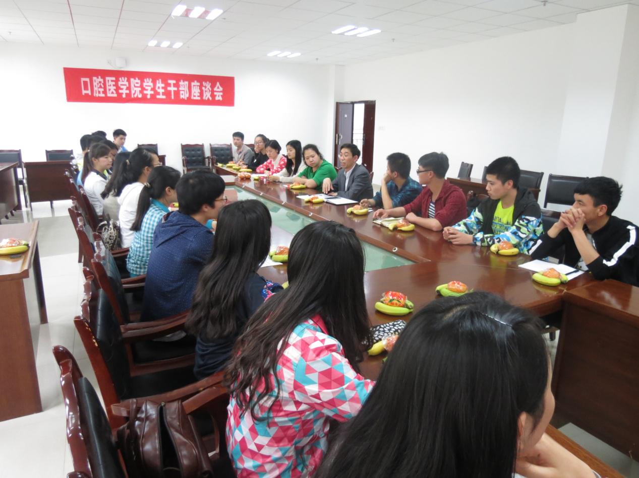 于4月29日召开新校区“口腔医学院干部座谈会”,党委副书记唐正龙、学生科科长钱禾、分团委书记张婷参会。