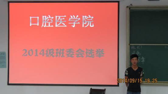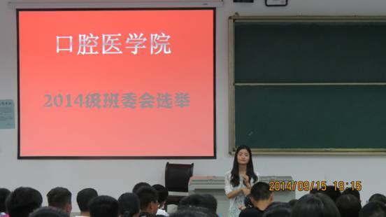 9月15日晚7时花溪新校区1401教室内,2014级口腔医学院正在举行班委选举大会。2014级全体学生、部分学生会成员、辅导员张婷老师参与。此次大会竞争的职务有“班长”、“副班长”等11个职位,2014级学生积极参加此次选举,他们的热情、积极也深深感染了我们,一时间竞选场面激烈但又处处体现着这个大家庭的团结友爱。随后由学生会成员进行唱票,最后此次竞选大会在张婷辅导员的讲话后结束。