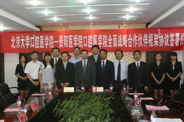 7月17日,《北京大学口腔医学院与贵阳医学院口腔医学院全面战略合作伙伴框架协议》签署仪式在我校老校区行政楼6楼连廊会议室举行。北京大学口腔医学院院长郭传瑸教授、口腔医学院党委副书记张祖燕教授、牙周病科栾庆先教授、口腔修复科谭建国教授、口腔颌面外科甘业华教授及我校院办主任冉江舟、人事处处长李兴、科技处处长郭兵、学生处处长赵平、研究生院院长杨勤、教务处副处长冯广卫、教师工作处副处长陆德琴,口腔医学院党委书记张军梅、院长马洪、党委副书记唐正龙、副院长王永等参加了签约仪式。