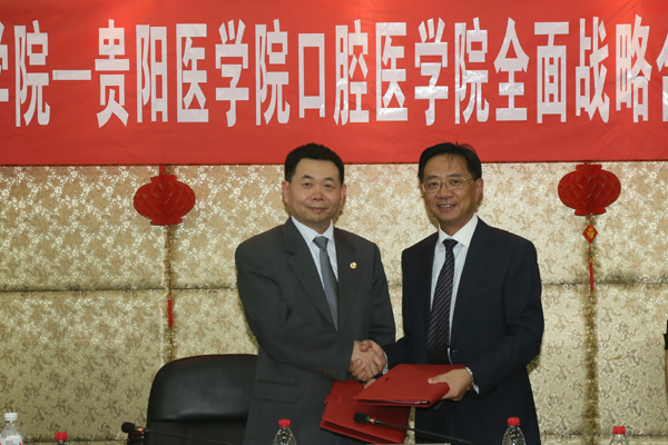 最后,北京大学口腔医学院院长郭传瑸教授与我校口腔医学院院长马洪教授上台签署了《北京大学口腔医学院与贵阳医学院口腔医学院全面战略合作伙伴框架协议》。