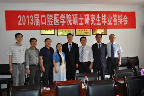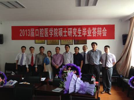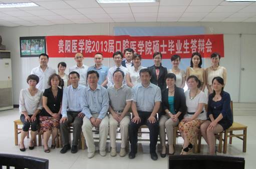 2013年5月25日,贵阳医学院口腔医学院2013年口腔临床医学硕士研究生毕业答辩顺利圆满完成,19名口腔医学科研型及临床型硕士学位研究生全部通过毕业论文答辩。本次答辩分别在口腔颌面外科专业会场和口腔修复科、口腔正畸科、口腔内科专业会场同时进行答辩。本次答辩会特别邀请到远道而来的四川大学华西口腔医学院口腔正畸系主任大白丁教授和苏州大学李浩莹教授,以及遵义医学院党委副书记、牙体牙髓病专家刘建国教授、遵义医学院口腔医学院黄桂林教授、宋庆高教授。省内口腔医学界的多位知名专家如贵州省人民医院罗洪教授、杨文龙教授、贵阳市口腔医院令狐昌智主任、郑之峻主任也应邀参加。作为口腔医学院研究生导师的贵州省卫生厅厅长宋宇峰教授也在百忙之中认真参加了他的研究生毕业答辩会。