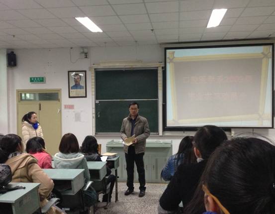 2013年1月7日,我系在3102教室举行“口腔医学系第二届雕牙比赛颁奖仪式暨2009级毕业实习动员大会”。会议由辅导员胡睿老师主持,出席大会的有:口腔医学系主持工作的副主任马洪老师,党总支副书记郭永洪老师,教学科研管理科副科长梁燕老师,口腔内科教研室主任王金生老师,口腔修复科教研究室主任王永老师,口腔正畸科教研室副主任徐卫华老师等。2009级全体学生参加大会。