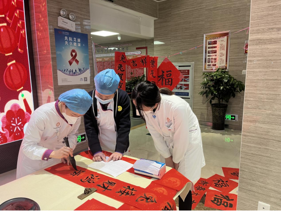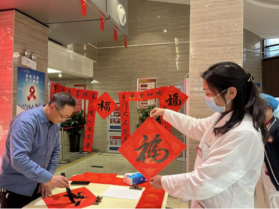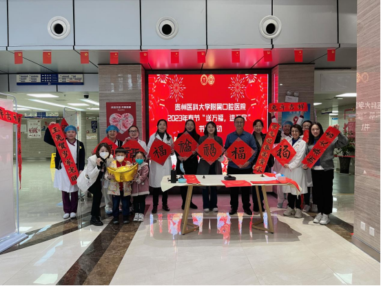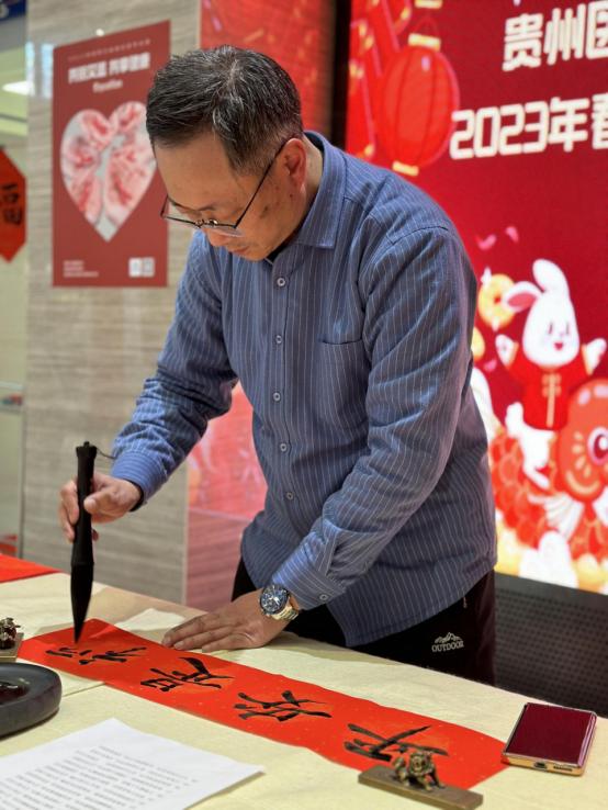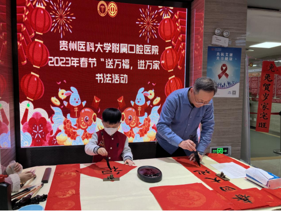 “迎新春 贴春联”是中华民族传统文明,寓意着吉祥如意。为弘扬中华优秀传统文化,丰富职工精神文化生活、凝聚职工精神力量,营造欢乐祥和的节日氛围,根据贵州省教育工会《关于在2023年元旦春节期间开展“送万福、进万家”书法公益活动的通知》(黔教工字〔2022〕71号)文件要求,1月12日,在医院党委和行政的关心支持下,工会组织开展了“送万福,进万家”书法活动,为全院职工书写春联和“福”字。副院长王永、党委副书记何雨羲出席活动,各分工会主席和职工代表参加活动,活动由工会主席杨蕾主持。
