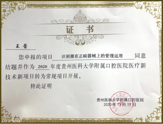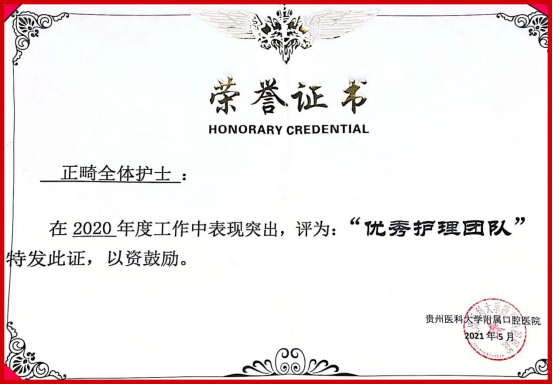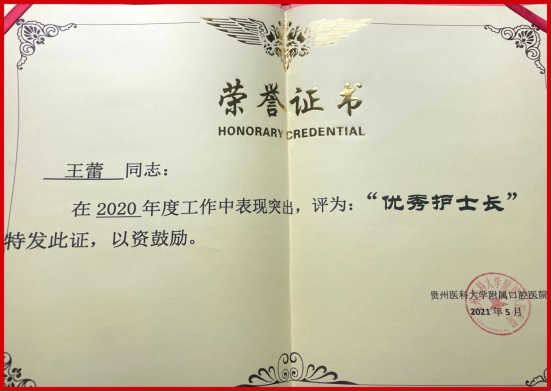 五年间,护理团队依靠扎实的理论基础、专业的服务技能,曾多次荣获各项荣誉、称号,其中曾有护理人员在“贵阳市医疗卫生临床技能竞赛”荣获藻酸盐印模材料调拌技术比赛一等奖、玻璃离子水门汀调拌技术比赛二等奖,王蕾曾荣获医院“优秀护士长”称号,徐静静曾荣获医院“优秀带教老师”称号,陈代凤曾获得“5·12”国际护士节口腔科普演讲比赛二等奖……