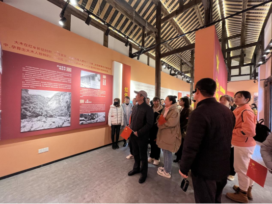 走访参观过程中,大家了解到大木村位于修文县六屯镇,这里村落狭长,房屋鳞次栉比,古树参天,村容整洁。1935年4月3日,中央红军长征从开阳白马洞翻山穿过马颈子进入六屯境内并驻宿大木寨一带,红军到来之后便在寨中进行革命宣传,书写大幅标语,其中“红军是乾人的军队”这条标语写在农户李忠良的房屋外墙上,历经近一个世纪,这幅标语依然清晰醒目,这是为了贫困老百姓得以解放而书写的标语,它如一块“路标”,激励着大木村的村民不断奋进,这是党留下的宝贵精神财富,代表了我们党和中国工农红军的革命主张,代表了一种长征精神、革命精神,这些红色精神永不褪色!