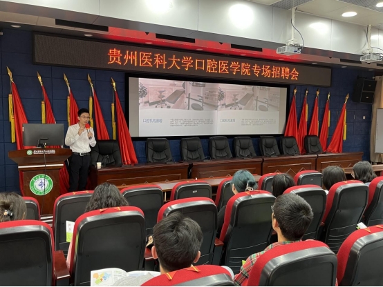 为深入贯彻教育部及学校关于高校毕业生就业工作的决策部署,扎实推进访企拓岗促就业专项行动,进一步强化校企合作,提高学生就业率,5月16日,口腔医学院在行政楼5楼召开访企拓岗交流会,广东省中山市松鼠口腔医疗集团总经理蒋伟鸣作就业讲座。贵州医科大学党委委员、副校长田晓滨;口腔医学院党委书记张军梅出席会议,学生管理科负责人张婷及毕业班辅导员参加会议。会议由口腔医学院党委副书记何雨羲主持。