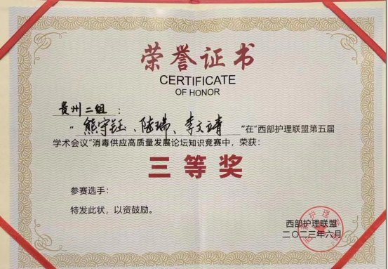 消毒供应室李文靖作为贵州省护理学会消毒供应中心专业委员会选派的贵州二队成员,与团队在此次竞赛中荣获佳绩。