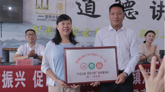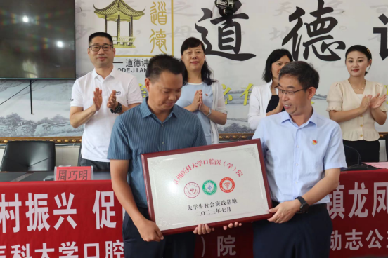 仪式上,张军梅、唐正龙分别授予撒拉溪镇“青春志愿 爱在口腔”医疗服务站及贵医口腔大学生社会实践基地牌匾。