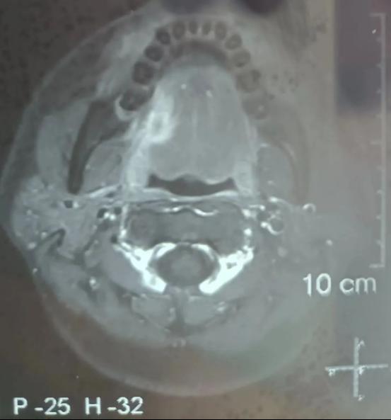 口腔颌面外科住院治疗,完善病理活检及颌面部MRI检查后明确为右舌缘鳞状细胞癌,临床分期为cT3N0M0,且肿瘤已侵犯右侧舌外肌。
