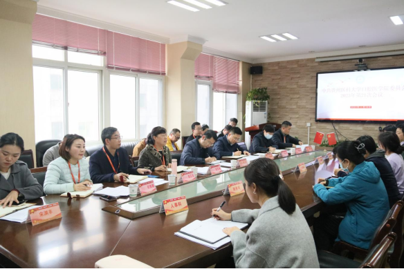 在行政楼五楼会议室召开2023年第21次党委会和第19次党政联席会。贵州医科大学党委副书记刘文,机关党委委员、书记陆法钢,基础医学院宋渊丰一行到会指导工作。院党委书记张军梅主持会议,党政领导班子成员出席会议。会议从理论学习“第一议题”开始,按议题顺序逐项开展,议题相关科室主要负责同志列席。