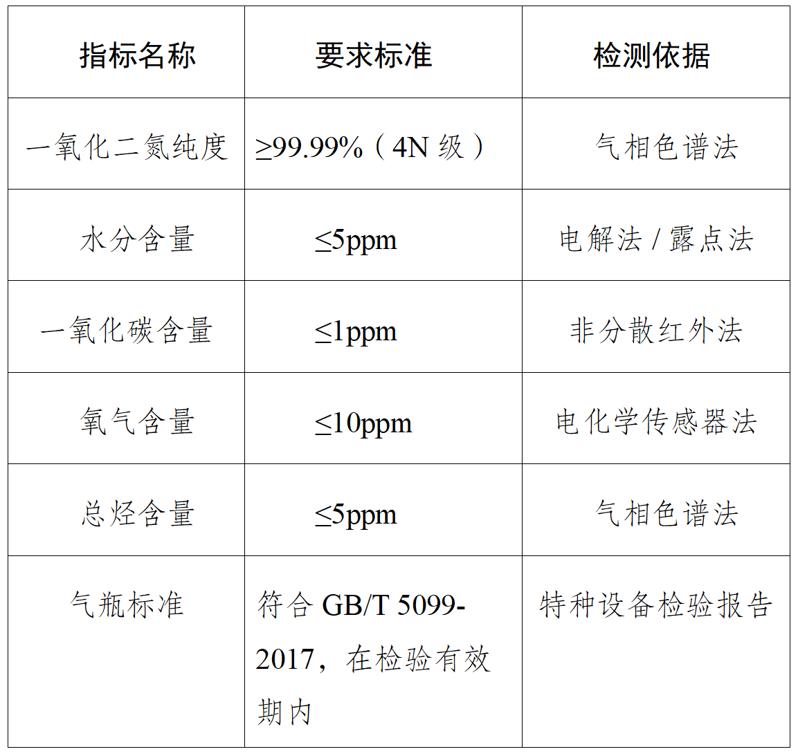 供应商提供的医用级笑气需同时满足《中国药典》及 GB/T 28729-2012 国家标准,关键指标如下: