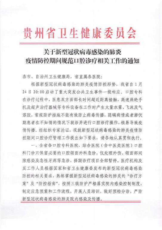 省卫健委关于新型冠状病毒感染的肺炎疫情防控期间规范口腔诊疗相关工作的通知