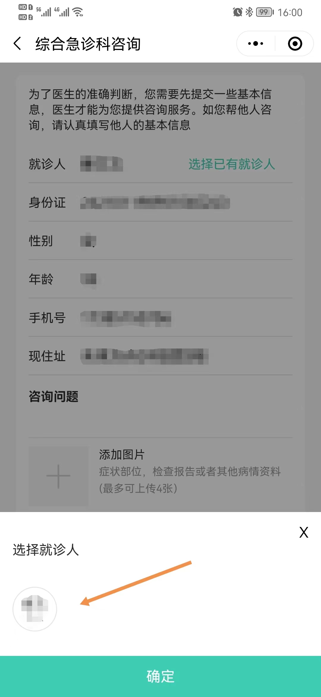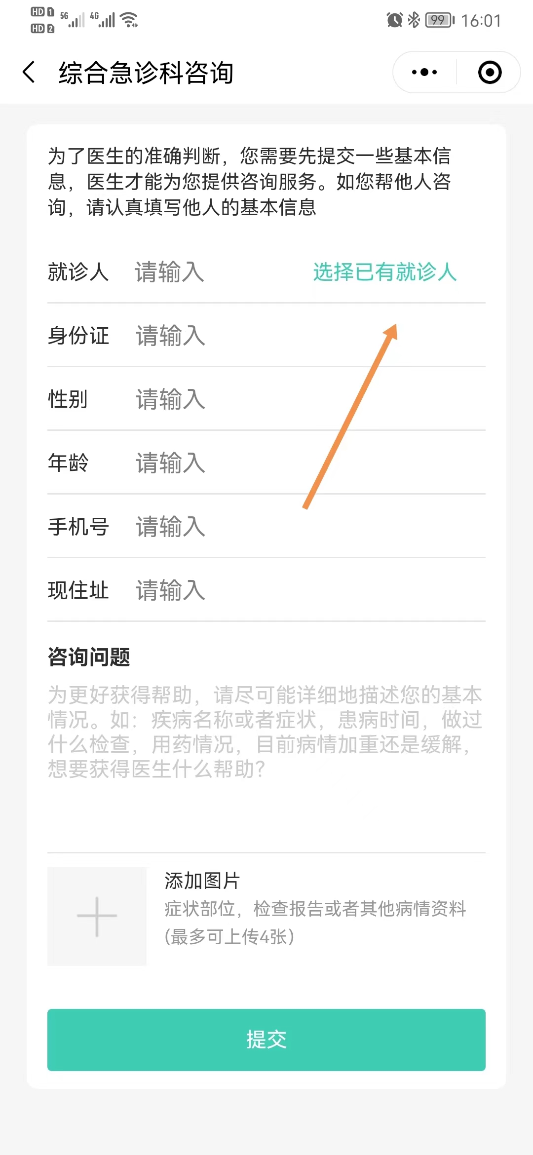 5. 已填写过基础信息在系统中建卡的就诊人,可点击“【选择已有就诊人】”自动填写相关信息,后进入咨询页面;