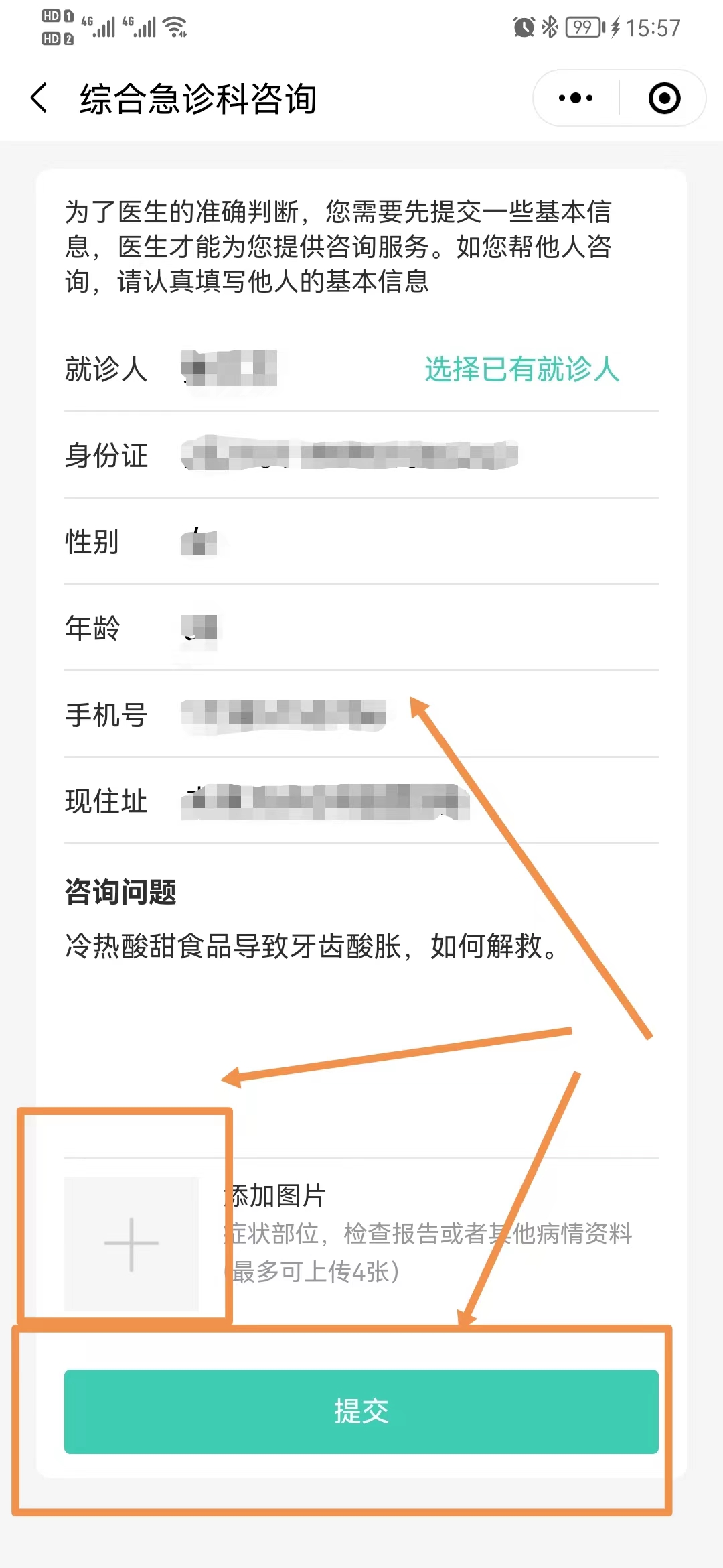 4. 首次咨询的就诊人需如实填写个人资料,有条件可附上相关图片及文字描述,在系统中建卡,后点击“【提交】”进入咨询页面;