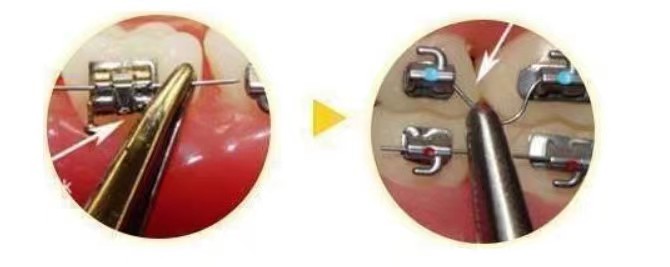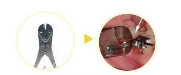 (1) 钢丝滑出:①用镊子夹住弓丝将弓丝向滑出相反方向轻微移动将其复位。若无法复位,则使用粘膜保护蜡或口香糖包裹末端防止扎嘴。③可使用剪刀或细头钳子剪断长出的弓丝。