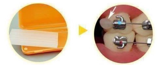 (2) 钢丝扎嘴(结扎丝与弓丝):若为结扎丝扎嘴,可以采用圆钝物体比如筷子、铅笔头等将结扎丝重新压到弓丝的下方操作过程中力量不要过大,避免托槽松动脱落。若为主弓丝扎嘴,则建议使用粘膜保护蜡或口香糖包裹扎嘴部位(如上图所示