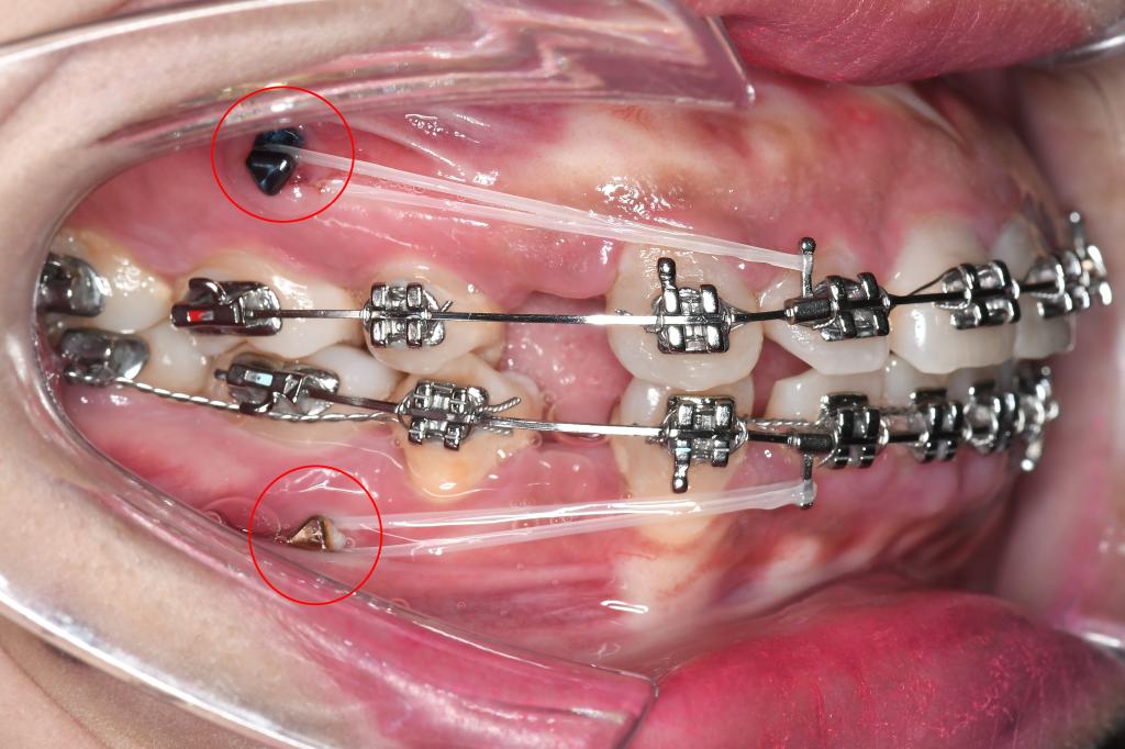 (5)种植钉松动脱落:种植钉已松动,暂停橡皮筋牵引,如果种植钉松动度过大或种植钉部位持续疼痛,患者可尝试逆时针轻轻旋转取出种植钉,种植钉取出后,可辅助使用漱口水维持口腔卫生。这里需要注意的是,若为双侧种植钉,一侧松动脱落,无法进行牵引,则另一侧同样也暂停牵引。