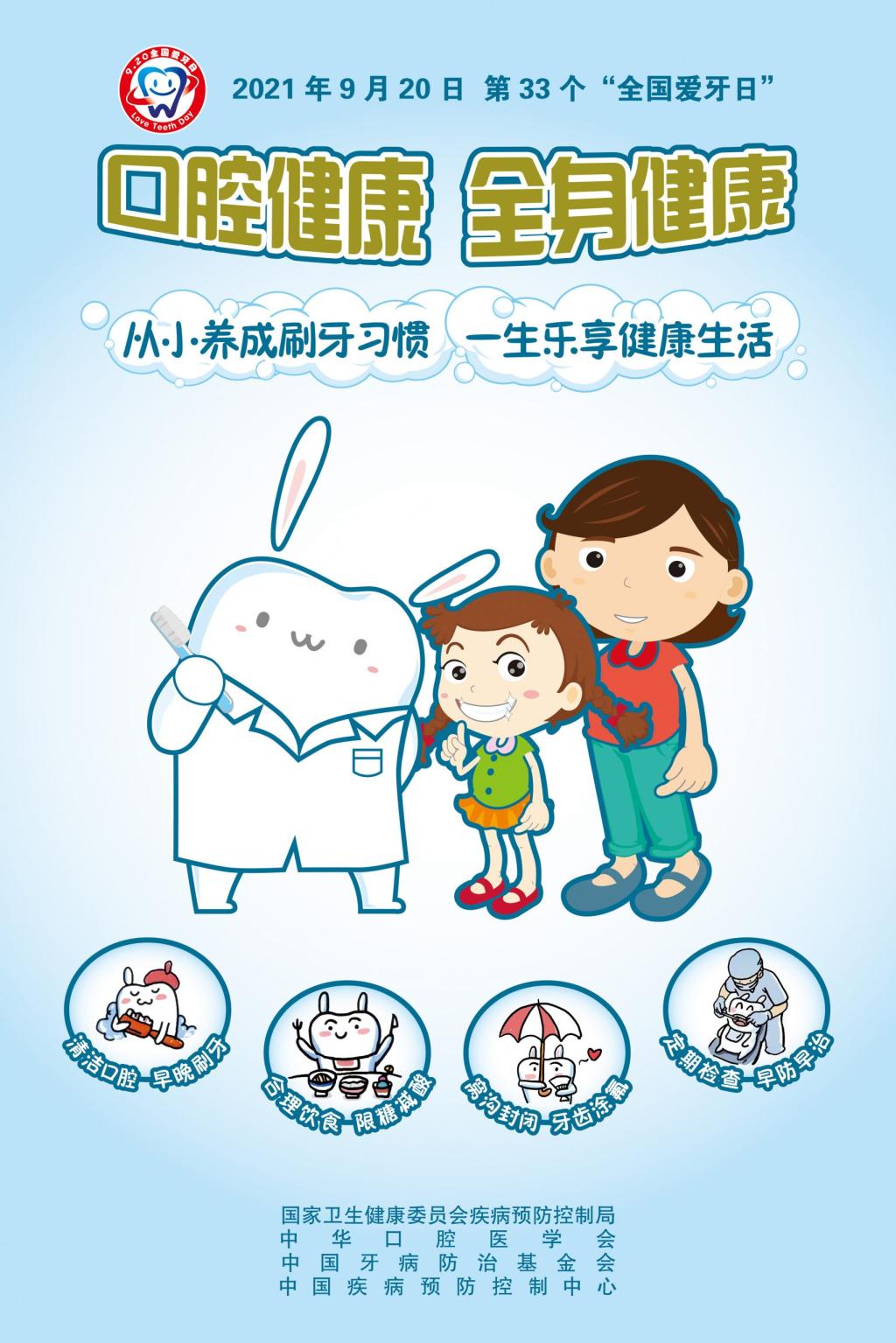 2021 年 9 月 20 日是第 33 个“全国爱牙日”,今年的活动主题是“口腔健康 全身健康”,副主题是“从小养成刷牙习惯 一生乐享健康生活”,旨在贯彻落实《健康中国行动(2019-2030 年)》和《健康口腔行动方案(2019—2025 年)》的指导方针和政策,提升群众口腔健康素养,创建有利于口腔健康的社会氛围。