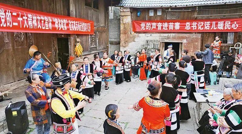 “党的声音进苗寨,总书记话儿暖民心。”贵州省安顺市普定县红色文艺“咿多哒蒙”(轻骑兵)进苗寨活动走进猫洞乡又奋村,