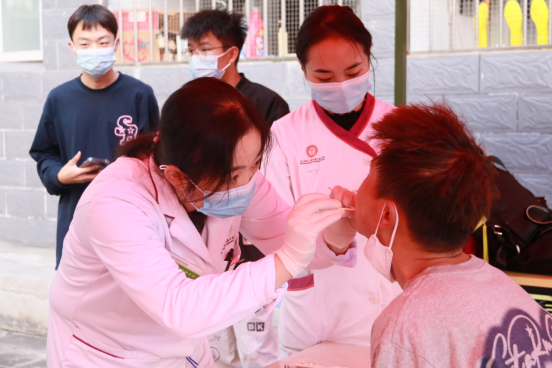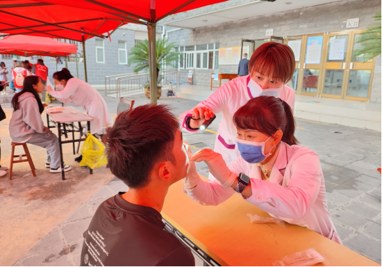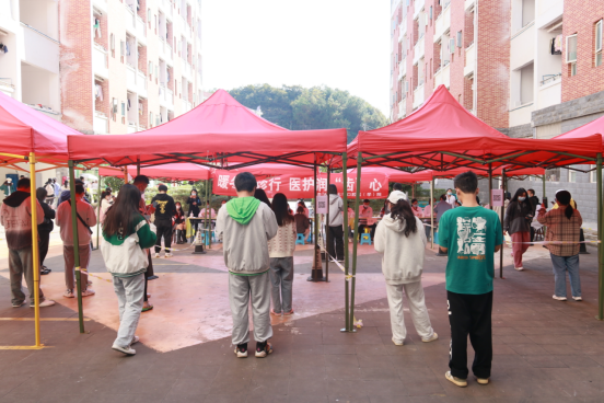 义诊在学校南校区思来社区学生宿舍区举行,共有五个义诊工作区(25个义诊工作台)和1个巡回诊疗车,同时为2022级新生各宿舍楼学生进行口腔健康体检。参加义诊的同学需要现场扫描二维码、填写流调信息、确认过往病史,便于医生更好诊断学生口腔健康情况并给出诊疗建议,同时为学生填写口腔检查反馈表。如有学生亟需进行诊疗,可在巡回诊疗车作进一步检查,并进行口腔洁治诊疗。