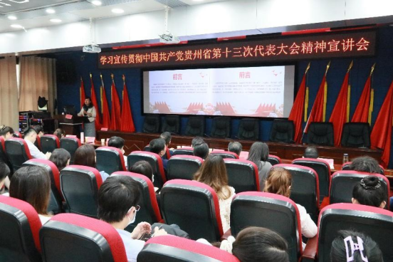 在行政楼五楼学术报告厅召开学习宣传贯彻中国共产党贵州省第十三次代表大会精神宣讲会。宣讲会由党委书记张军梅主讲,党委副书记、院长马洪主持。院党政领导班子成员及党委委员出席会议,全院副科级以上干部、全体党员、各民主党派人士、学生党员代表参加会议。