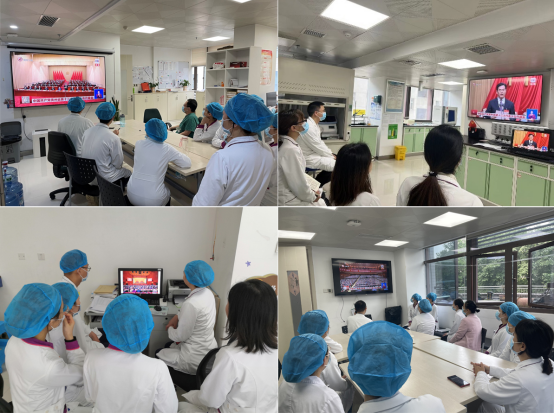 分三个主要阵地组织收看开幕会直播,副科级以上干部在学校北京路校区行政楼7楼连廊会议室集中收看;行政科室工作人员在院行政楼五楼学术报告厅集中收看;临床、医技科室教职医护员工在科室集中收看。