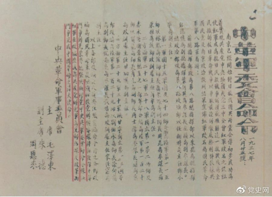 1937年8月25日,毛泽东和朱德、周恩来发出的关于红军改编为国民革命军第八路军的命令。