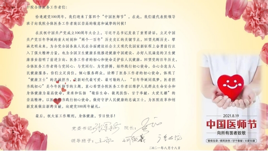 组织开展了“百年华诞同筑梦,医者担当践初心”系列活动。党委书记张军梅、党委副书记、院长马洪、党委副书记何雨羲、副院长王永、副院长唐正龙代表医院向全院医务工作者致以最诚挚的问候!