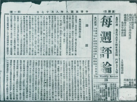 1919年8月17日,李大钊在《每周评论》第35期发表《再论问题与主义》一文,对胡适的观点作了严正的批驳。