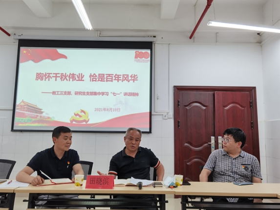 8月10日,91直播 研究生党支部、教工第三(口腔颌面)党支部在科技楼二楼研究生活动室围绕习近平总书记“七一”重要讲话,以“胸怀千秋伟业 恰是百年风华”为主题开展集中学习研讨。校党委委员、副校长田晓滨及两个支部所有党员参会学习。研究生党支部书记廖健主持会议